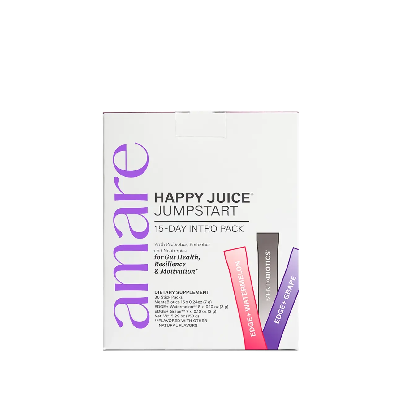 Approximately 90% of your serotonin is produced in your gut. When your gut is balanced and thriving, it sends signals to the brain that help support mood, mental clarity, and stress resilience. Formulated for the gut-brain axis, Amare Happy Juice combines the gut-nourishing ingredients of MentaBiotics, with the brain fueling ingredients of Amare EDGE+ to help you feel your best from the inside out.*